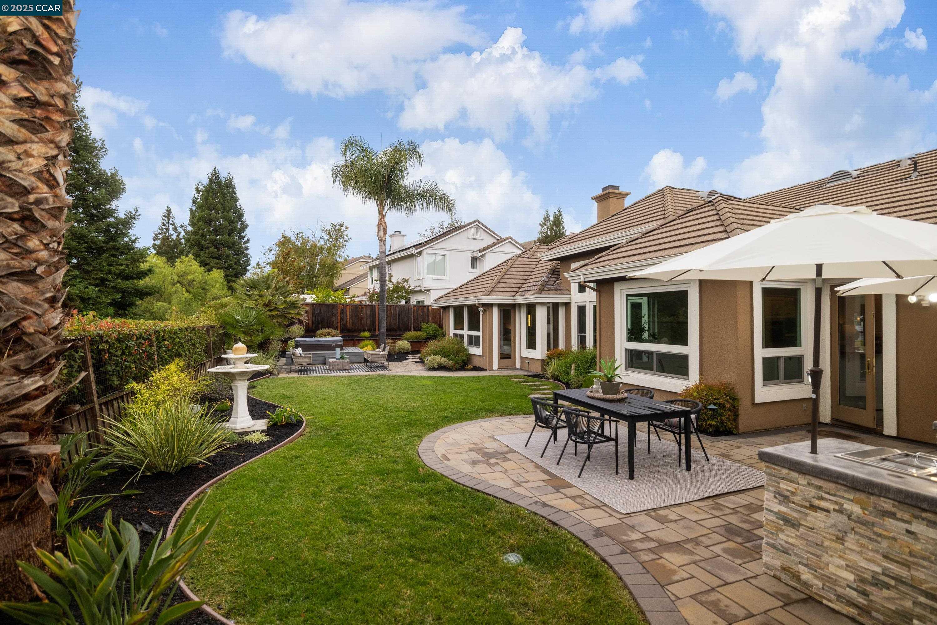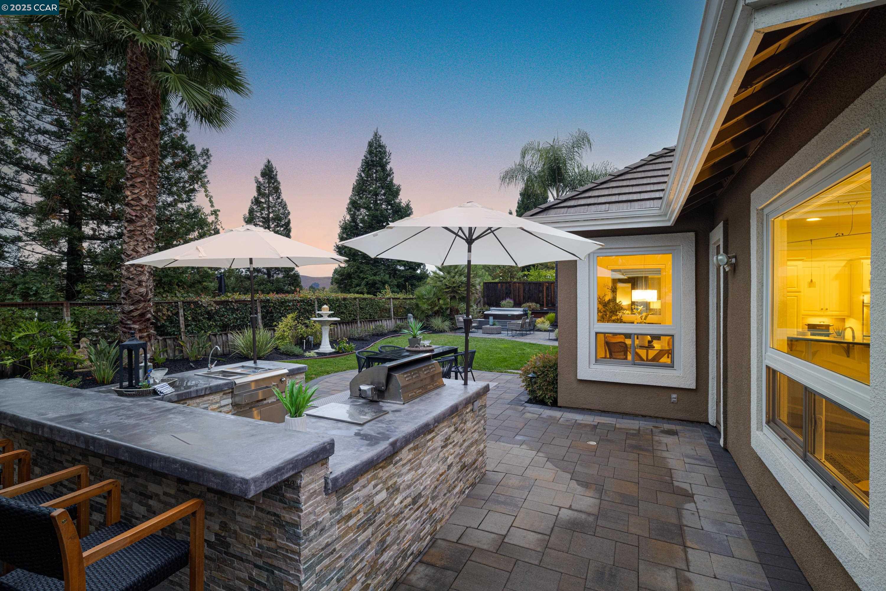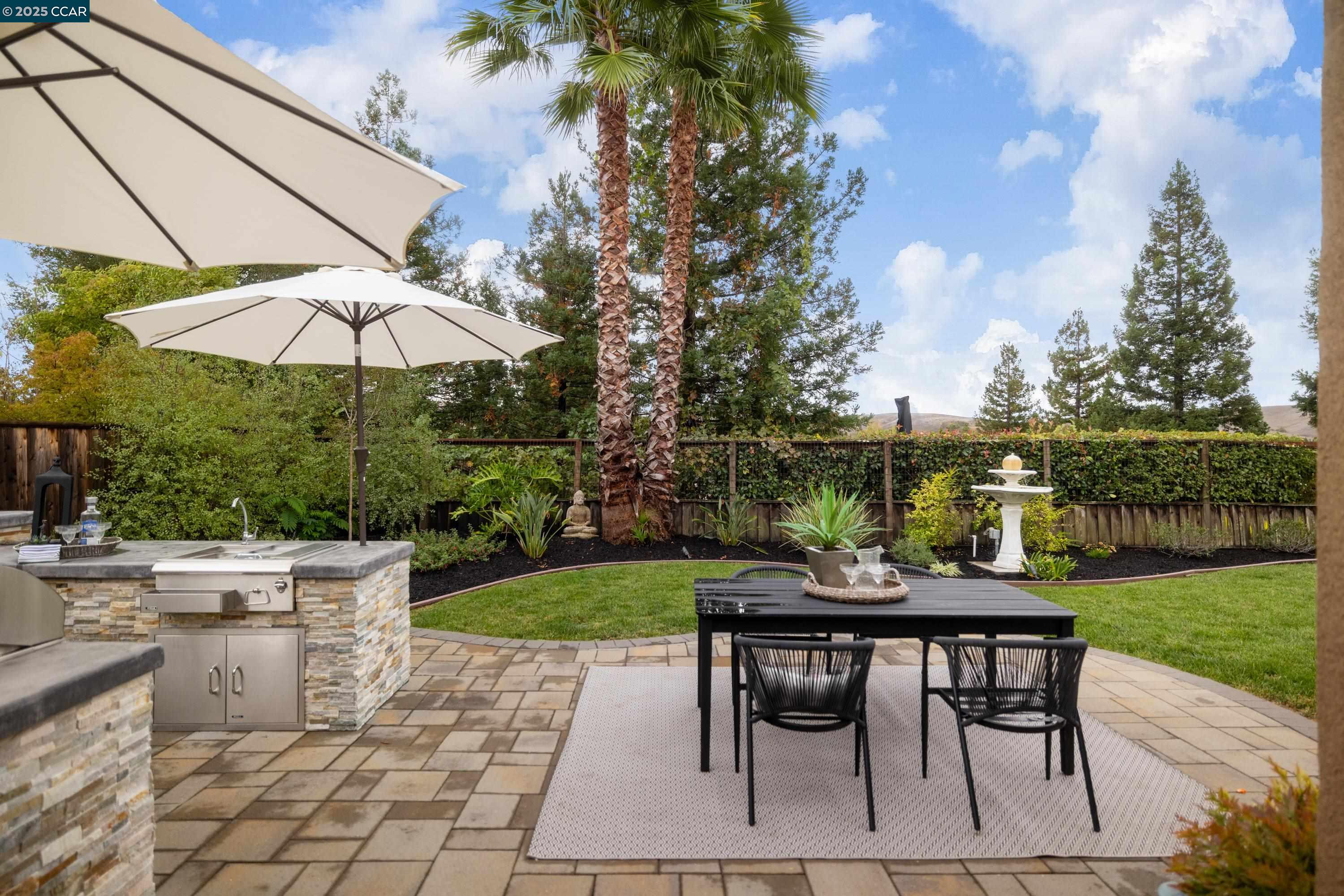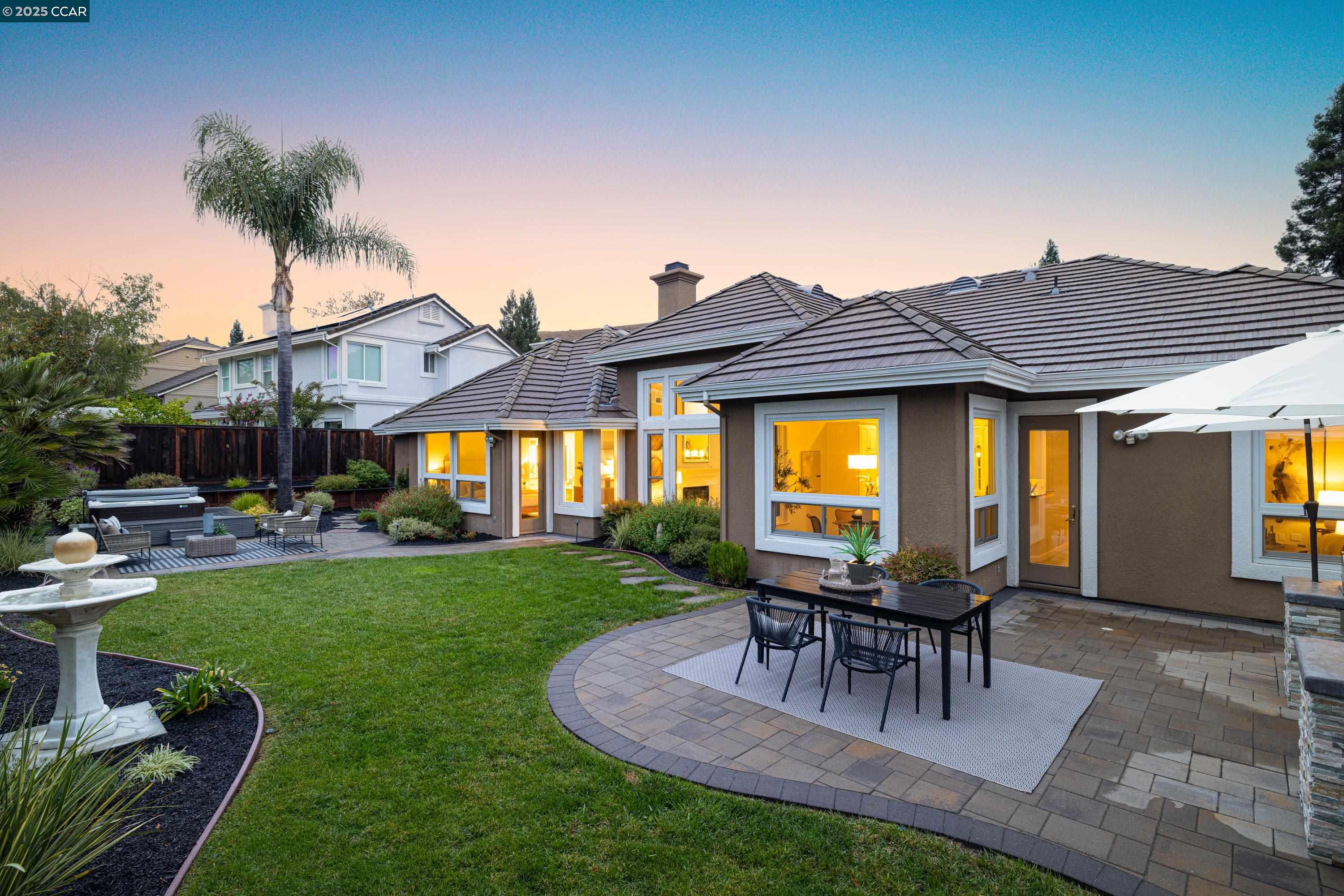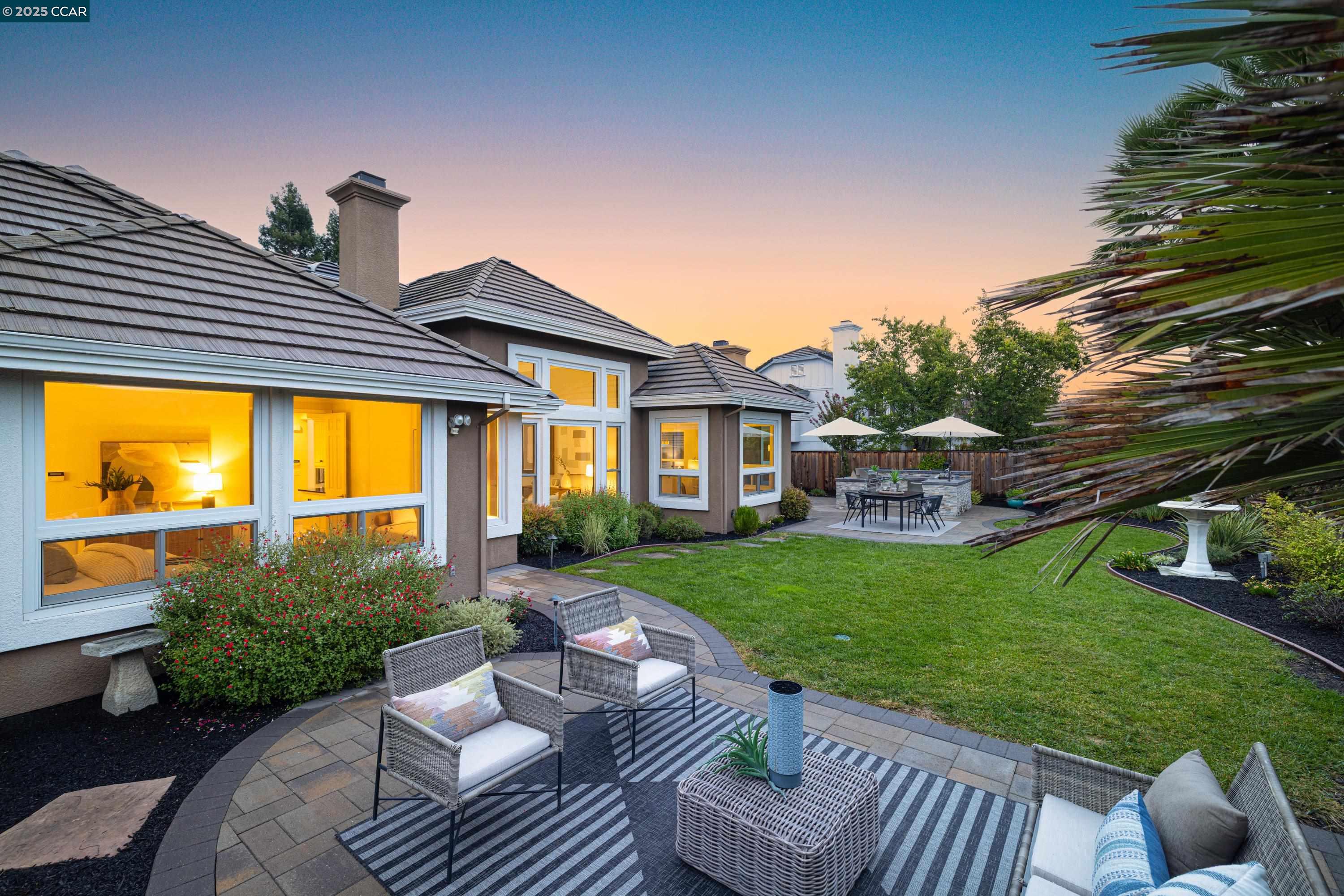 EXCEPTIONAL SINGLE STORY HOME. Impeccably upgraded home that seamlessly combines quality materials with an ideal layout. Featuring four generous bedrooms, one of which is currently utilized as a home office, this residence also offers formal living and dining rooms, a spacious family room, an oversized laundry room complete with a utility sink, and a convenient 3-car garage. Convenient location and award winning schools! The home showcases stylish upgrades, including engineered wood and tile flooring, complemented by plush new carpeting in the living room. The eat-in chef's kitchen is equipped with a commercial-grade gas cooktop, double convection ovens, and granite countertops, and it flows effortlessly into the family room. The expansive primary suite boasts a beautifully remodeled bathroom with two walk-in closets, accompanied by three additional roomy bedrooms. High ceilings and large windows throughout the property flood the space with natural light, enhancing the stunning views and warm ambiance that make this home truly special. Enjoy gorgeous sunsets as you host get togethers with the fully equipped outdoor kitchen and relaxing hot tub. Attractive low maintenance, drought resistant landscaping and newer exterior paint offer a property you'll be proud to call home.