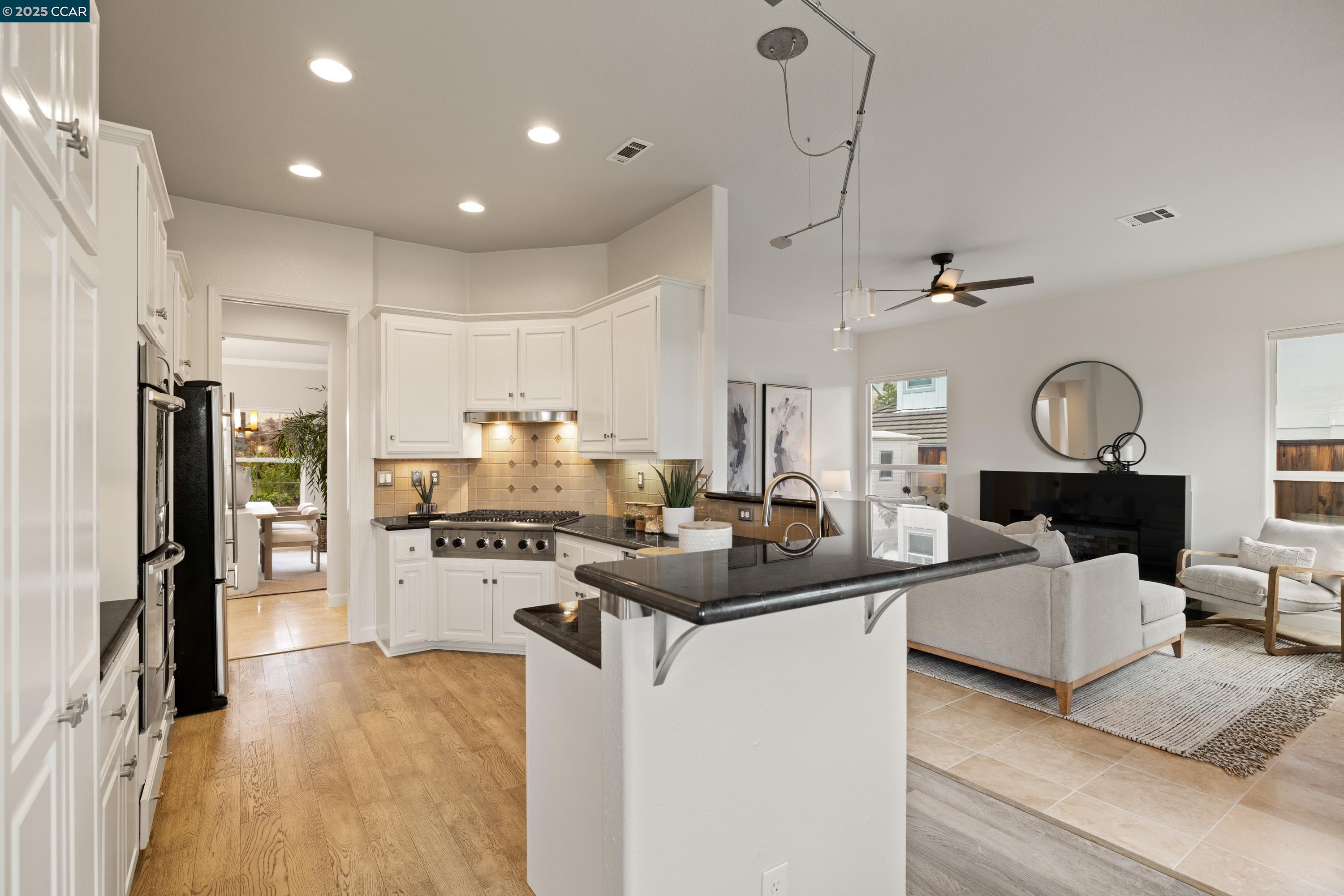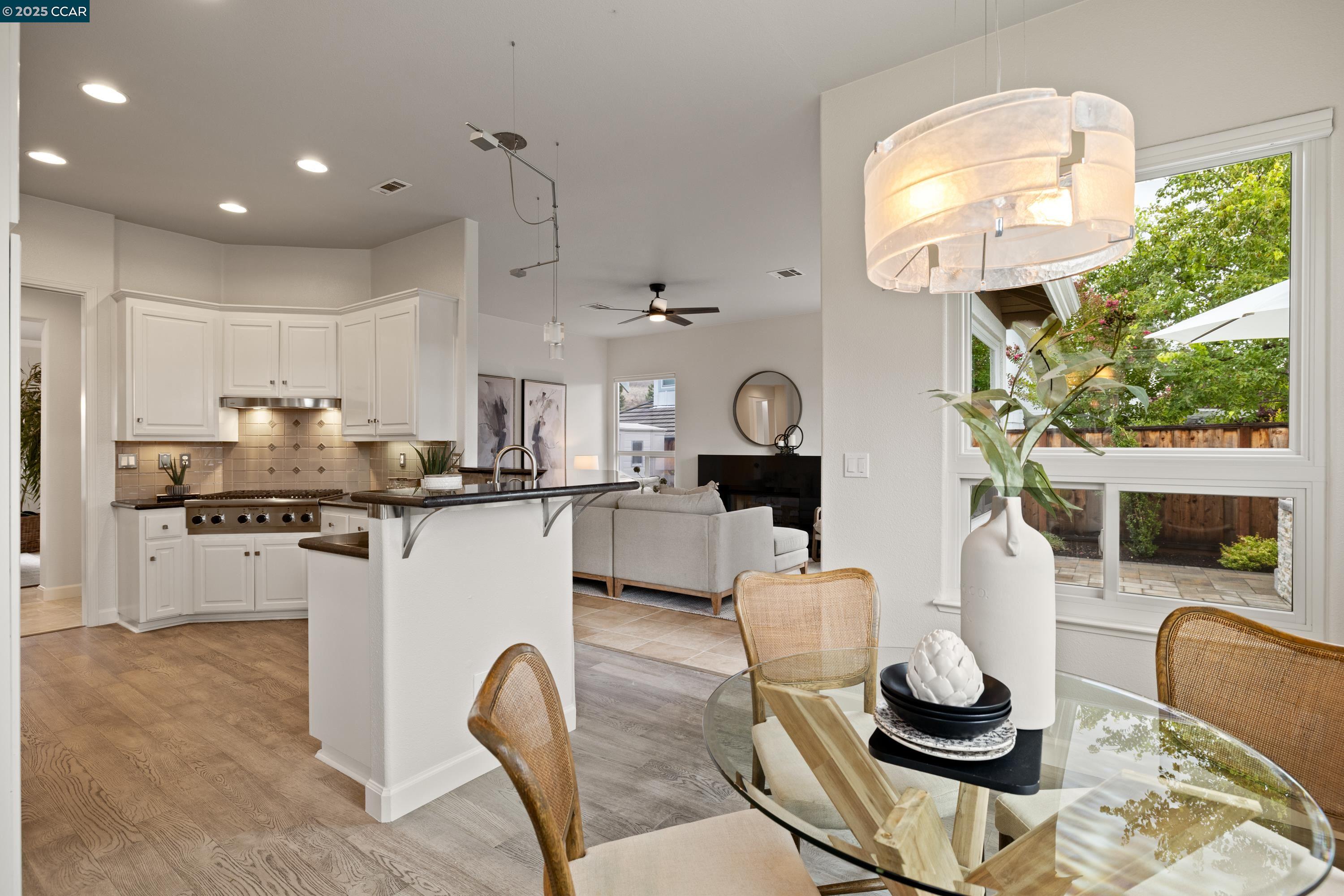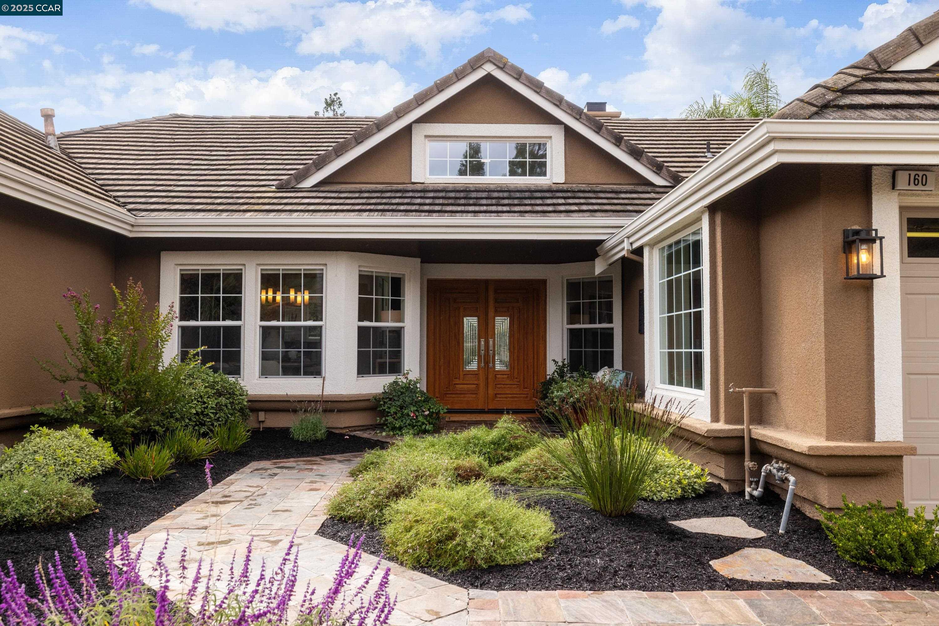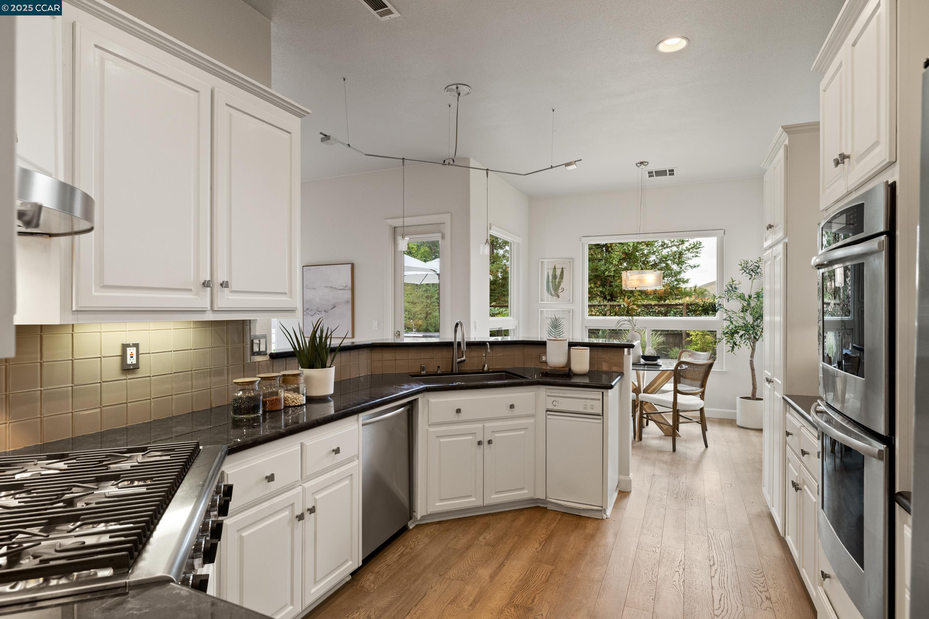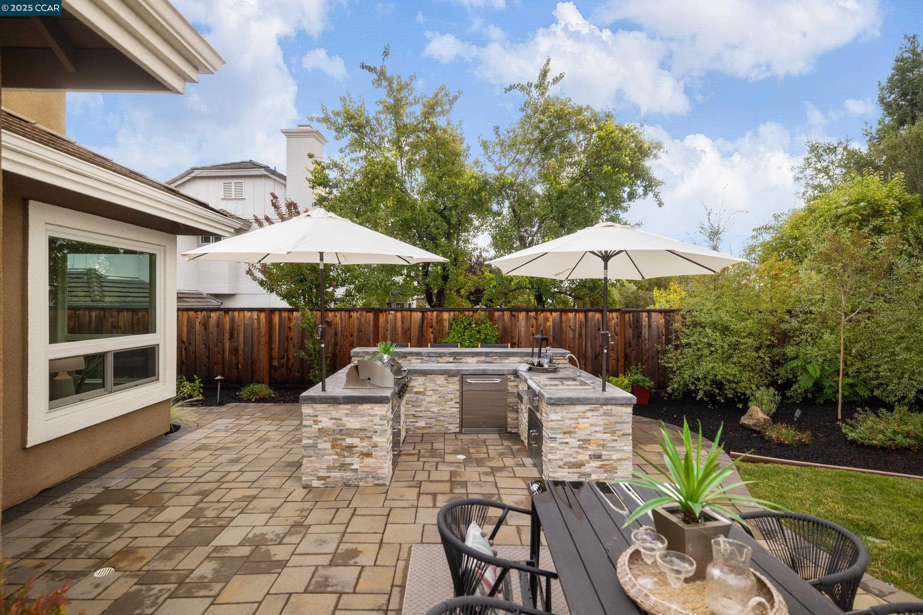 EXCEPTIONAL SINGLE STORY HOME. Impeccably upgraded home that seamlessly combines quality materials with an ideal layout. Featuring four generous bedrooms, one of which is currently utilized as a home office, this residence also offers formal living and dining rooms, a spacious family room, an oversized laundry room complete with a utility sink, and a convenient 3-car garage. Convenient location and award winning schools! The home showcases stylish upgrades, including engineered wood and tile flooring, complemented by plush new carpeting in the living room. The eat-in chef's kitchen is equipped with a commercial-grade gas cooktop, double convection ovens, and granite countertops, and it flows effortlessly into the family room. The expansive primary suite boasts a beautifully remodeled bathroom with two walk-in closets, accompanied by three additional roomy bedrooms. High ceilings and large windows throughout the property flood the space with natural light, enhancing the stunning views and warm ambiance that make this home truly special. Enjoy gorgeous sunsets as you host get togethers with the fully equipped outdoor kitchen and relaxing hot tub. Attractive low maintenance, drought resistant landscaping and newer exterior paint offer a property you'll be proud to call home.