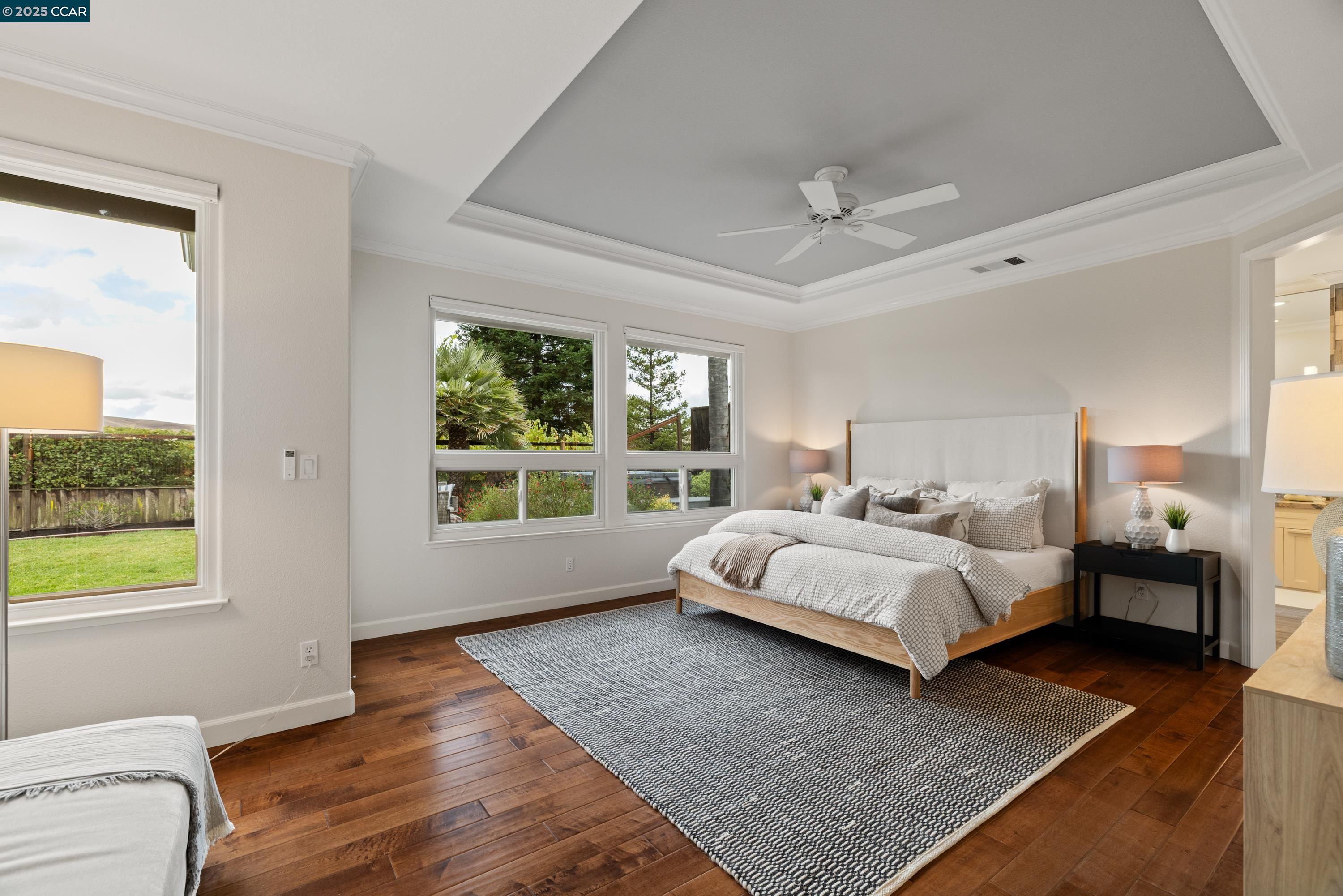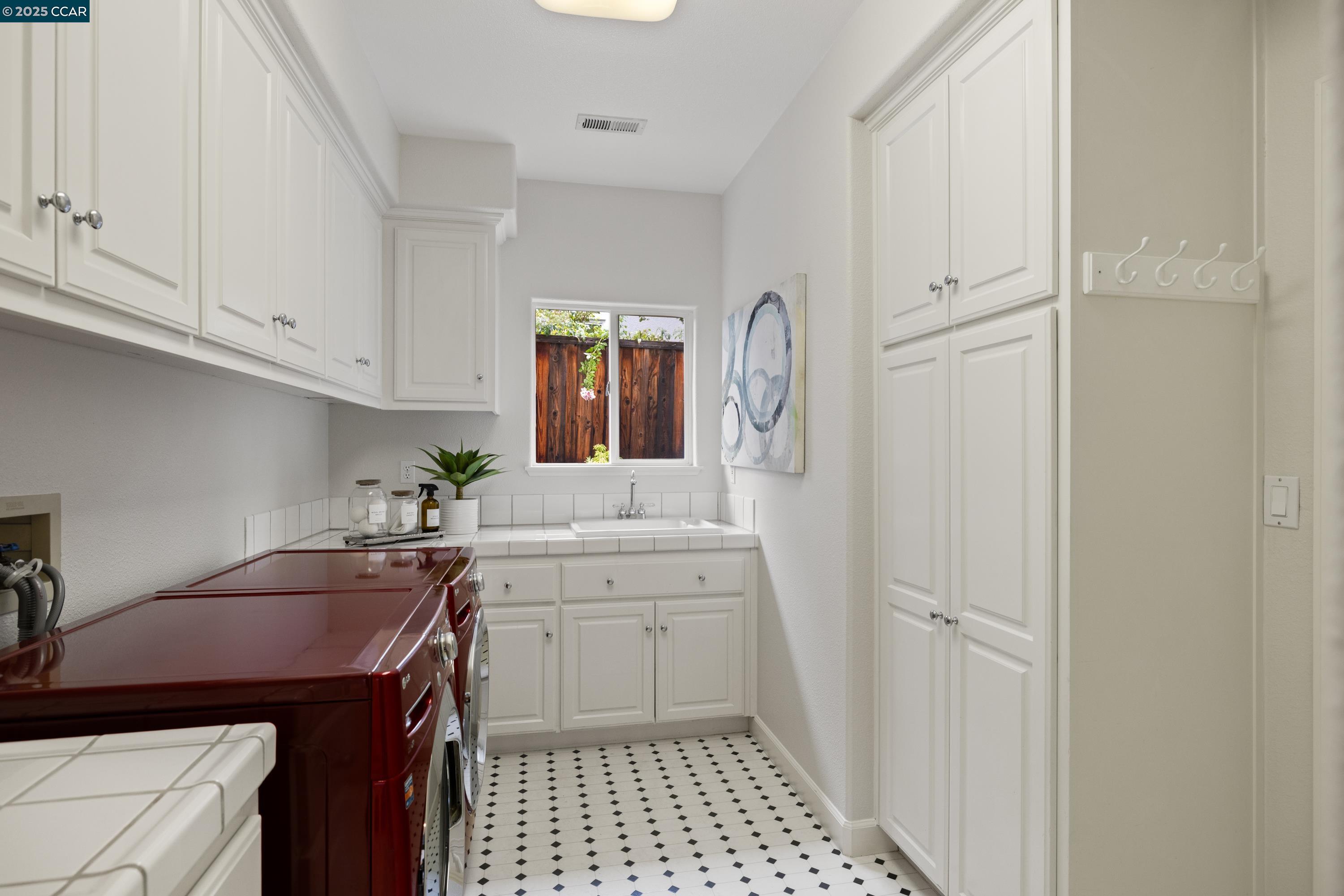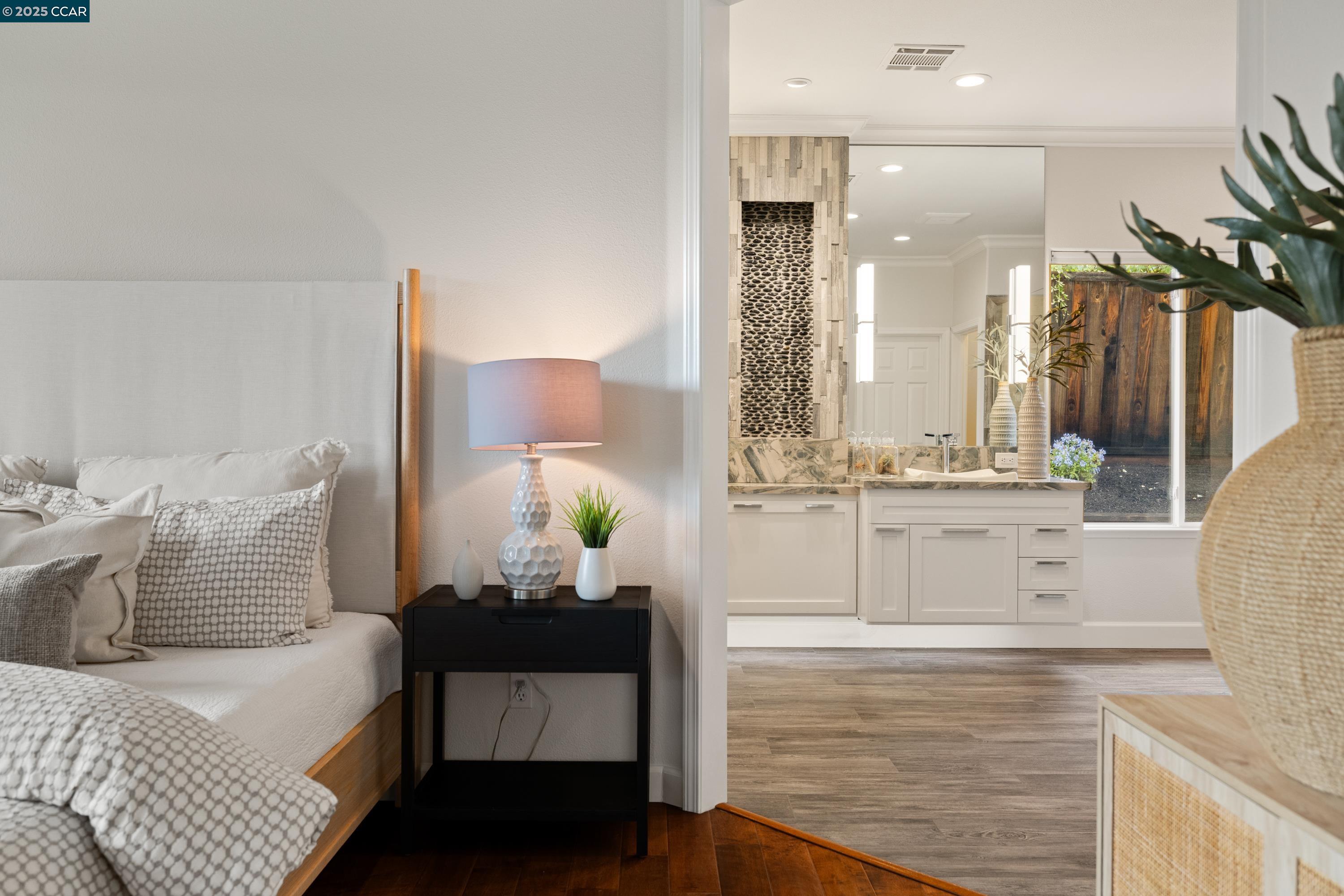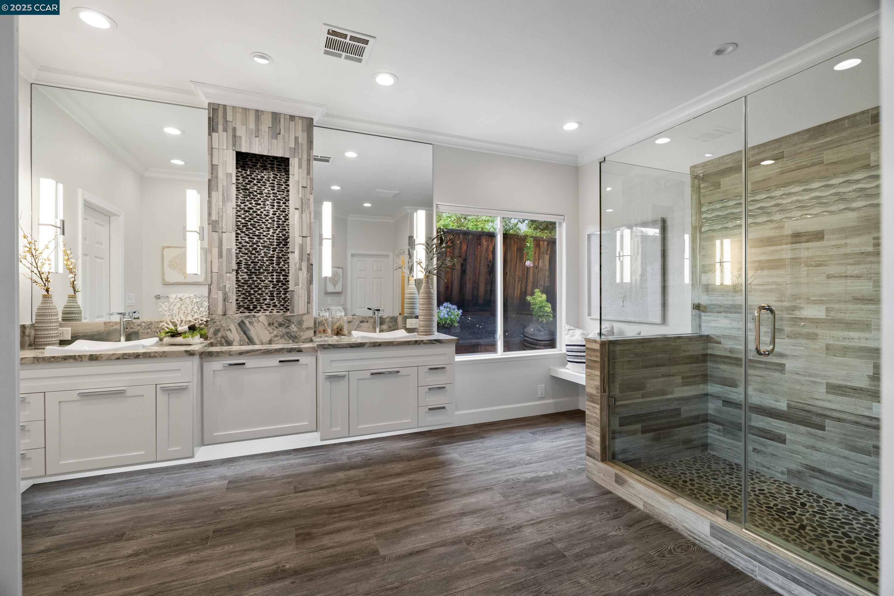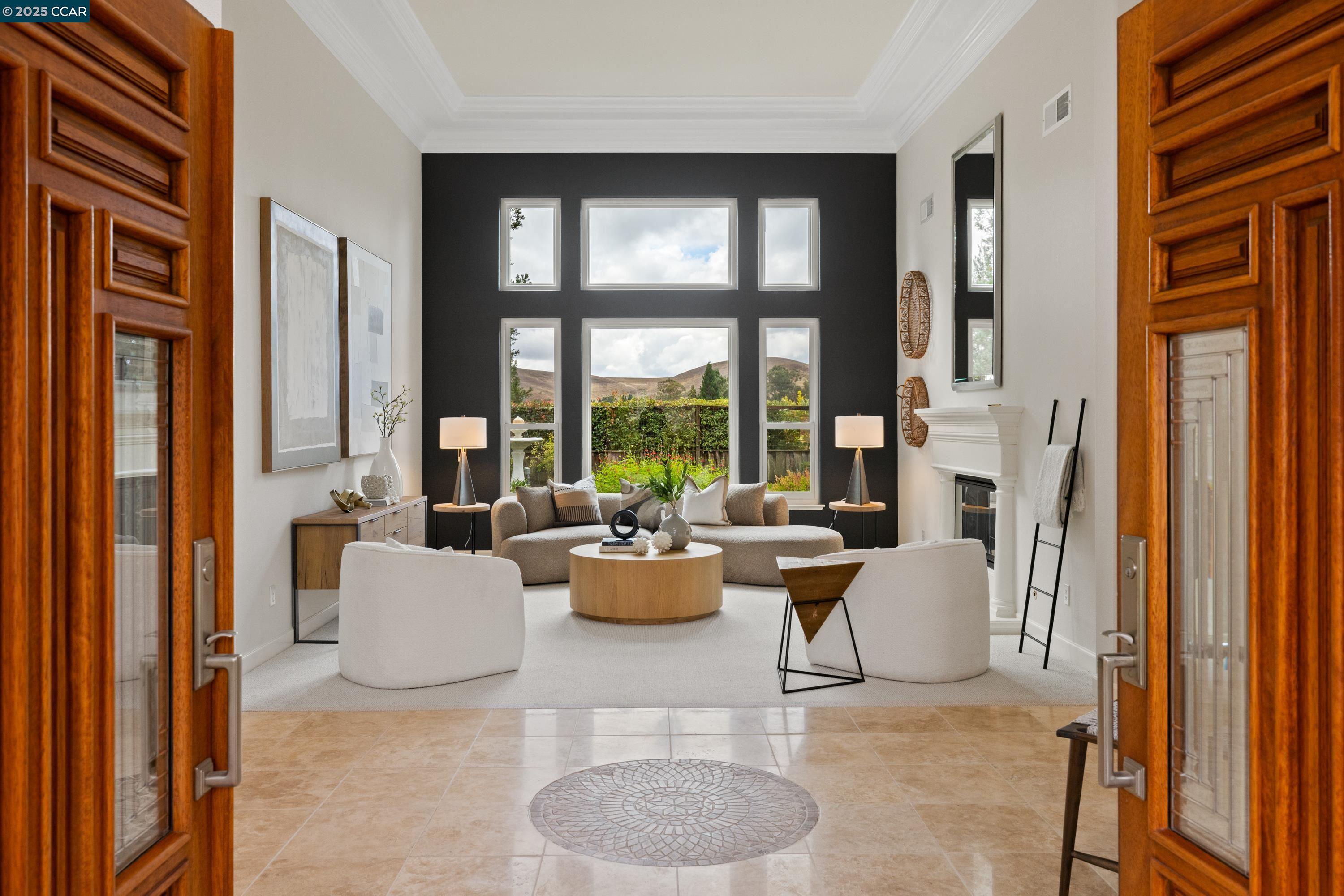 EXCEPTIONAL SINGLE STORY HOME. Impeccably upgraded home that seamlessly combines quality materials with an ideal layout. Featuring four generous bedrooms, one of which is currently utilized as a home office, this residence also offers formal living and dining rooms, a spacious family room, an oversized laundry room complete with a utility sink, and a convenient 3-car garage. Convenient location and award winning schools! The home showcases stylish upgrades, including engineered wood and tile flooring, complemented by plush new carpeting in the living room. The eat-in chef's kitchen is equipped with a commercial-grade gas cooktop, double convection ovens, and granite countertops, and it flows effortlessly into the family room. The expansive primary suite boasts a beautifully remodeled bathroom with two walk-in closets, accompanied by three additional roomy bedrooms. High ceilings and large windows throughout the property flood the space with natural light, enhancing the stunning views and warm ambiance that make this home truly special. Enjoy gorgeous sunsets as you host get togethers with the fully equipped outdoor kitchen and relaxing hot tub. Attractive low maintenance, drought resistant landscaping and newer exterior paint offer a property you'll be proud to call home.